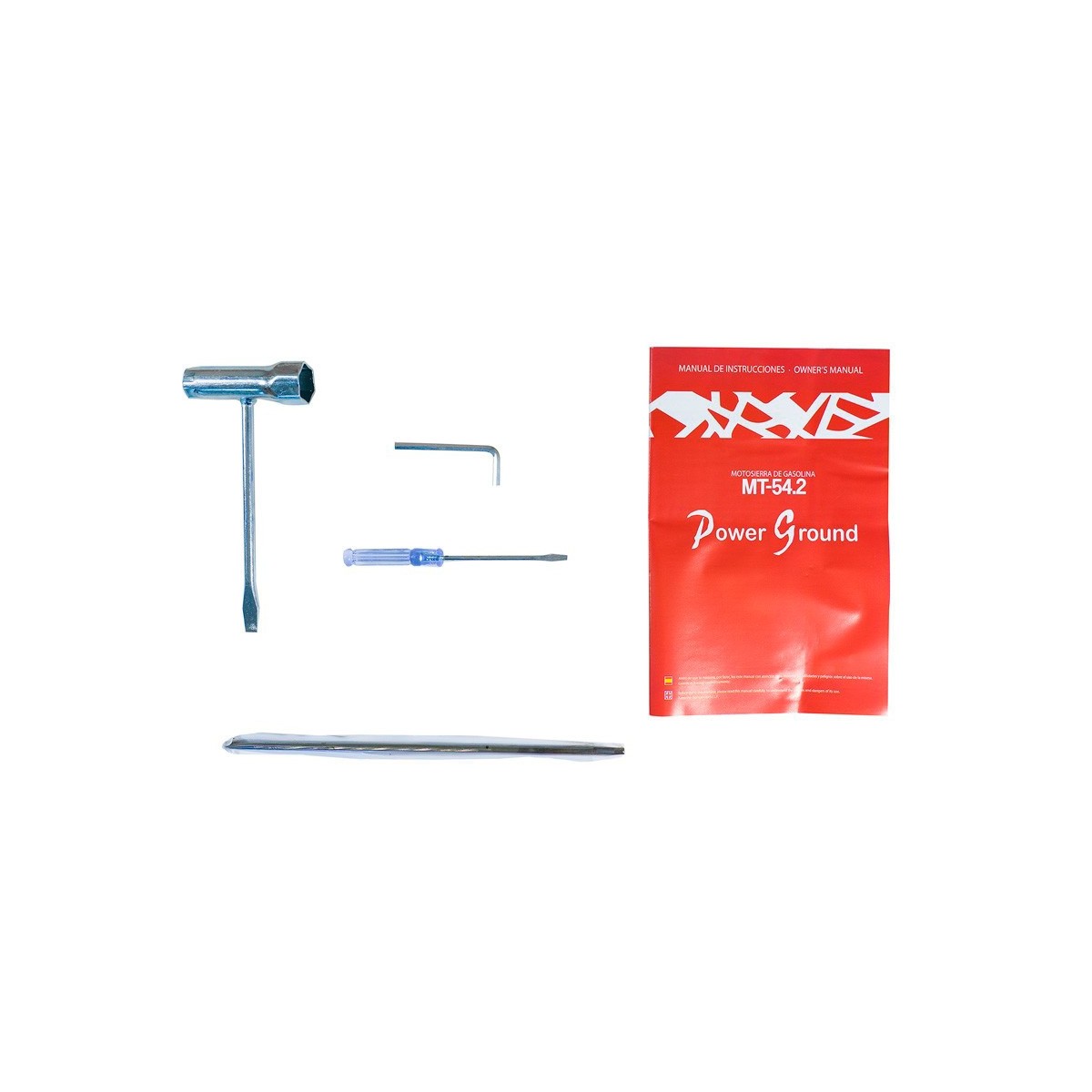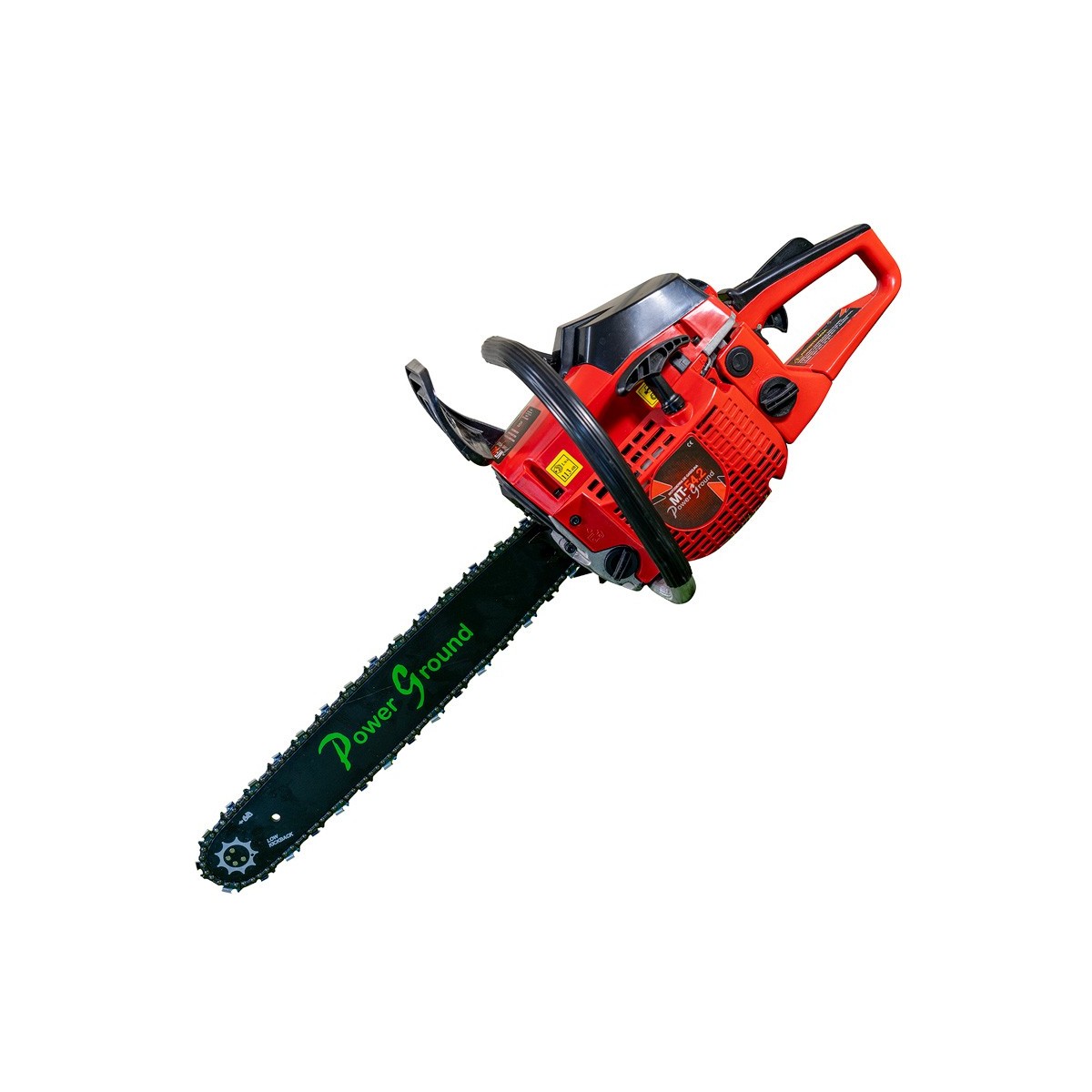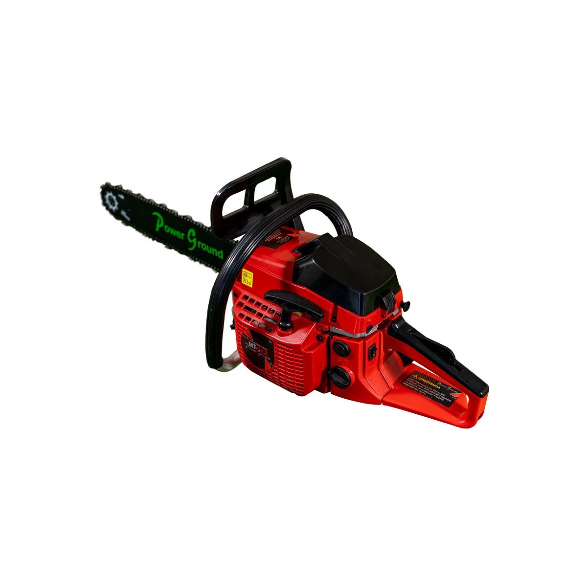 La motosierra de gasolina PowerGround, monta un sistema de agarre diseñado en material reforzado con anti deslizamiento, con lo que mantendremos nuestras manos bien agarradas y seguras mientras trabajamos con ella. En su lateral izquierdo encontramos el manillar de aluminio, montado sobre un sistema de goma Silent Blocks que absorbe cualquier vibración para evitar que llegue a nuestras muñecas. Justo al otro lado, tenemos el control con el estrangulador de aire, el botón de seguridad, accionador del gas y el paro del motor.
